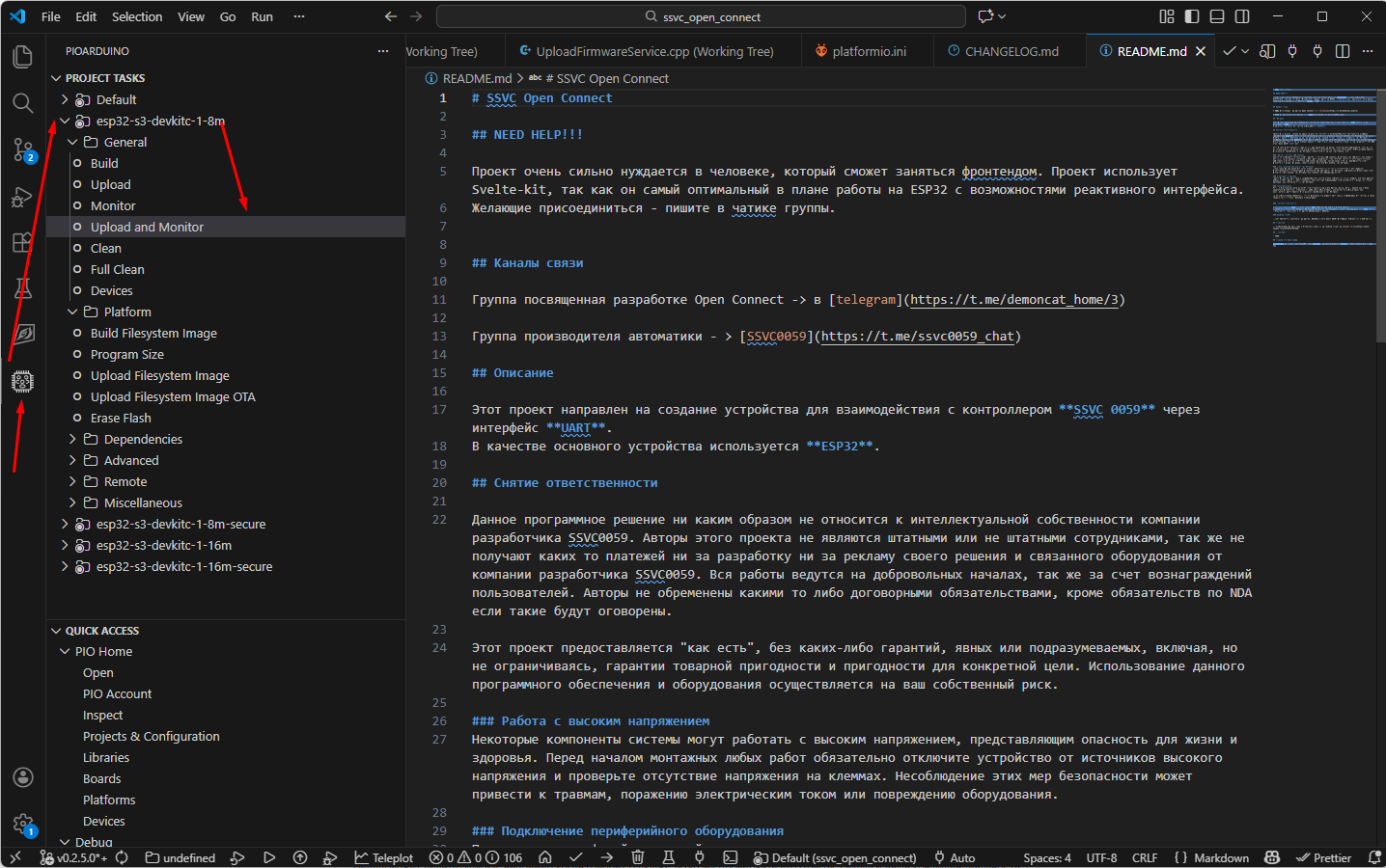 **Upload and Monitor ** Скомпилирует код и загрузит его в контроллер и затем автоматически откроет терминал для просмотра логов через Serial-порт.