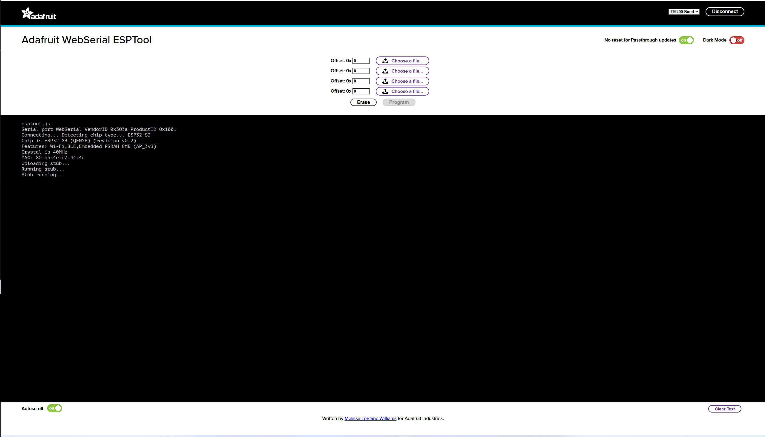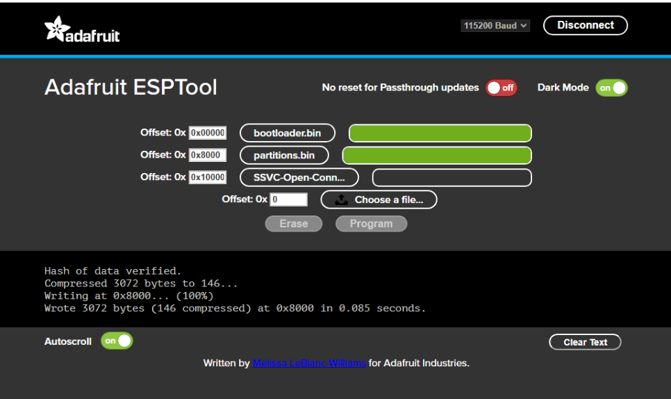 В случае когда по различным причинам прошивка через встроенный прошивальщик SSVC Open Connect не срабатывает, можно воспользоваться сервисом Adafruit WebSerial ESPTool