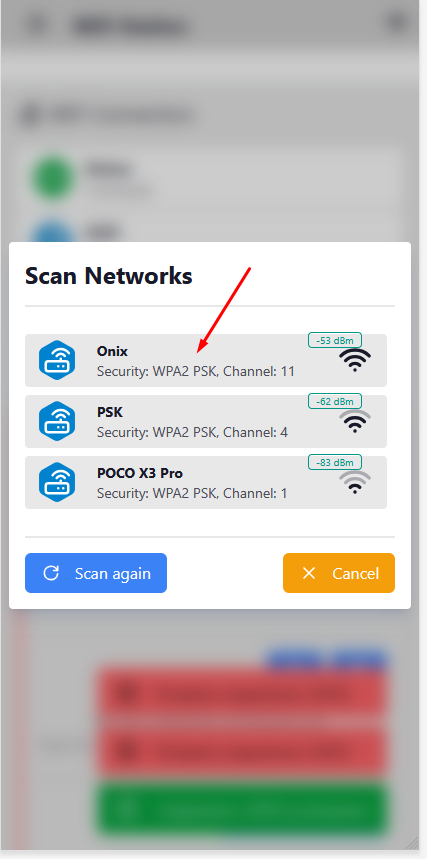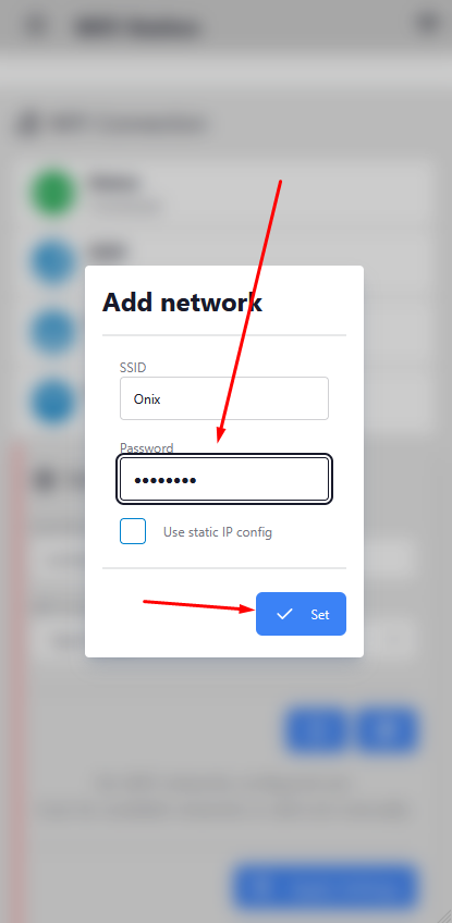 На открытой странице переходим в меню настроек WIFI, и нажимаем на кнопку поиска сети. Выбираем нужную сеть, вводим пароль и нажимаем кнопку Set.